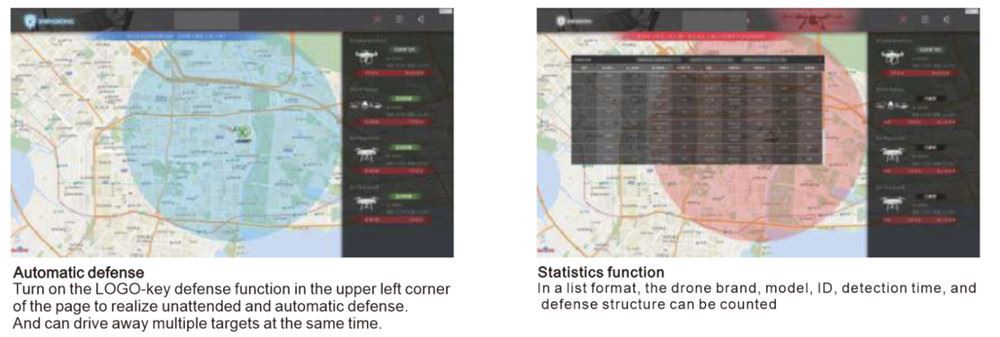 Para drones intrusivos, puede elegir: Defensa automática con una sola tecla: Después de activar la función de defensa del sistema, el dron intruso será defendido automáticamente por el sistema sin personal de servicio; Intervención manual: Puede elegir manualmente defender cualquier dron, y cómo time defense, o interrumpir la defensa, y puede elegir localizar al piloto.